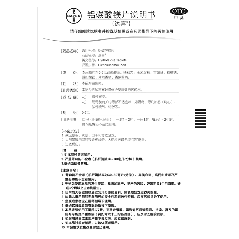 【注意事项】 1.肾功能不全者(肌酐清除率为30-80毫升/分钟),高美血症,高钙血症者及严重肾功能不全者慎用。 2.孕妇如使用本品后发生腹泻,易增加流产,早晨风险,妊娠其头3个月慎用,妊娠三个月以上应咨询医生。 3.目前尚无铝碳酸镁通过乳汁分泌的资料。哺乳期妇女应咨询医生。 4.尚无儿童用药和老年用药的安全性和有效性资料,应在医师的指导下使用 5.急腹症患者应在医师指导下使用。 6.低碳饮食的患者应在医师指导下使用。 7.本品连续使用不得超过7天,症状未缓解,请咨询医师或药师。持续复发的胃病有可能是严重疾病(例如胃或十二指肠溃疡) 8.如服用过量或出现严重的不良反应,过敏体质者慎用。 9.对本品过敏者禁用,过敏体质者慎用。 10.本品性状发生改变时禁止使用。 11.请将本品放在儿童不能接触的地方。 12.儿童必须在成人监护下使用。 13.如正在使用其他药品,使用本品前请咨询医师或药师。