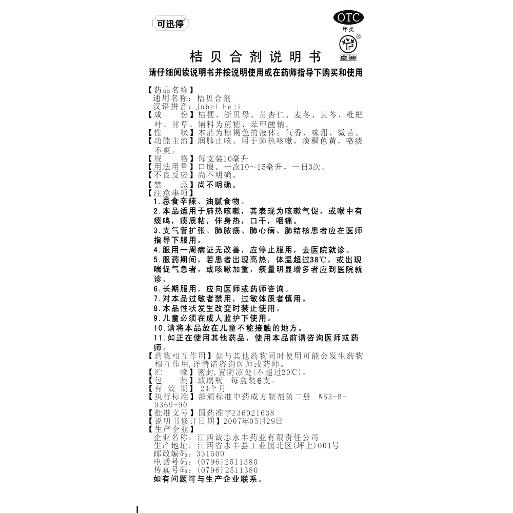 【药品名称】 桔贝合剂(可迅停)